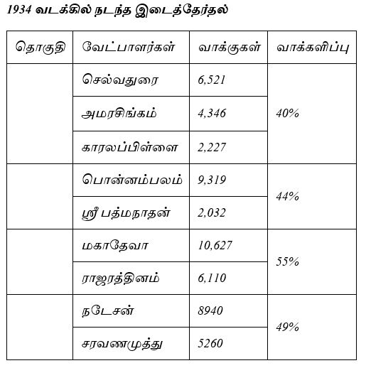 பின்னர் 1934இல் மீண்டும் வட மாகாணத் தமிழர்கள் பிரித்தானிய அரசைகேட்டுக்கொண்டதற்கிணங்க 1934 இல் தேர்தல்கள் நடத்தப்பட்டன. அதன்படி ஜீ.ஜீ.பொன்னம்பலம் (பருத்தித்துறை), அருணாச்சலம் மகாதேவா (யாழ்ப்பாணம்), நெவின்ஸ் செல்வதுரை (ஊர்காவற்துறை), எஸ்.நடேசன் (காங்கேசன்துறை) ஆகியோர் தெரிவானார்கள். ஆனால் அரசாங்க சபையில் எஞ்சிய ஒரு வருடத்திற்கு தான் அவர்களால் பிரதிநிதித்துவம் வகிக்க முடிந்தது.  டொனமூர் திட்டத்தின் கீழ் 1936 இல் நடந்த இரண்டாவது அரசாங்க சபைத் தேர்தலில் உருவான அரசாங்கத்தில் அமைச்சரவையானது தனிச்சிங்கள அமைச்சரவையாக ஆக்கப்பட்டதையும் இங்கே குறித்துக்கொள்வோம்.