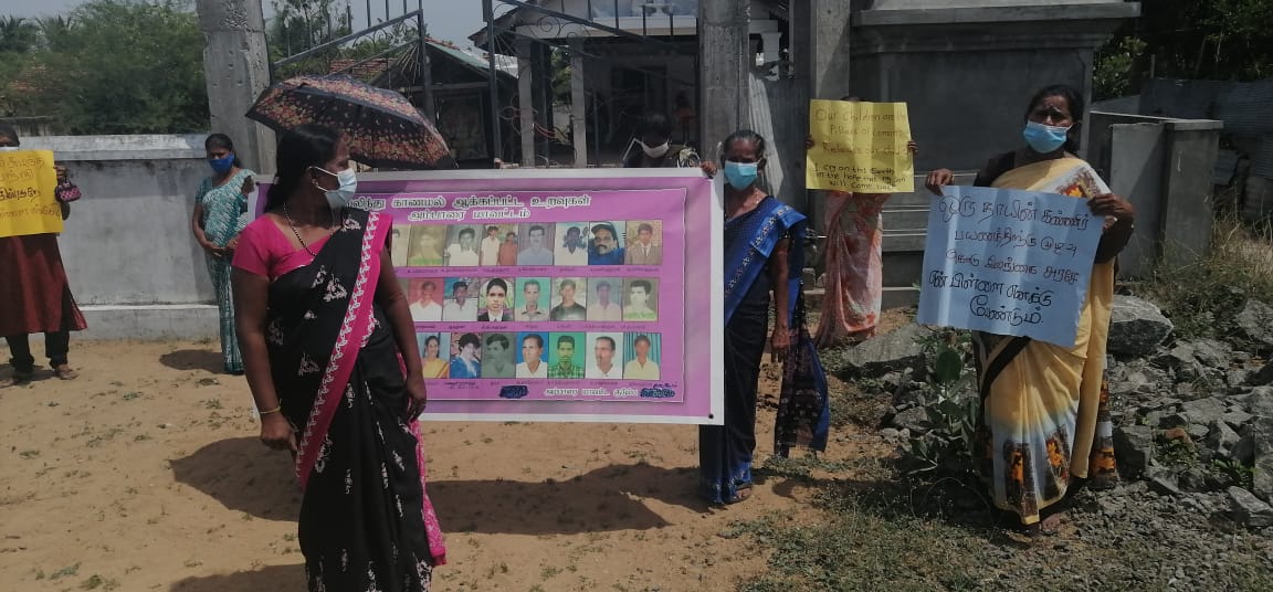 இதன்போது, தாயின் கண்ணீர்ப் பயணத்திற்கு முடிவு கொடு, பத்து மாதம் சுமந்த வயிறு பற்றி எரிகின்றதே எங்கள் பிள்ளைகள் எங்கே? எங்கள் பிள்ளைகள் எமக்கு வேண்டும், என் விழிகள் மூடமுன் என் பிள்ளைகளைக் காண வேண்டும் போன்ற பதாதைகளை ஏந்தியவண்;ணம் ஆர்ப்பாட்டம் முன்னெடுக்கப்பட்டது.