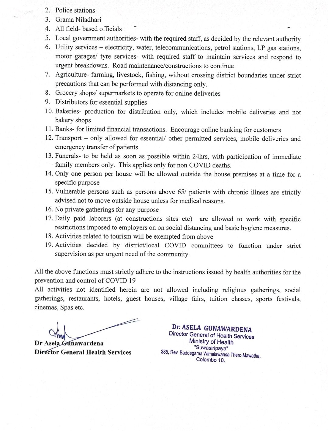 இந்நிலையில், ஊரடங்கு உத்தரவின் போது 19 செயற்பாடுகளுக்கு அனுமதி வழங்கப்பட்டுள்ளது. இது தொடர்பான விரிவான அறிக்கை ஒன்றை சுகாதார அமைச்சு வெளியிட்டுள்ளது.