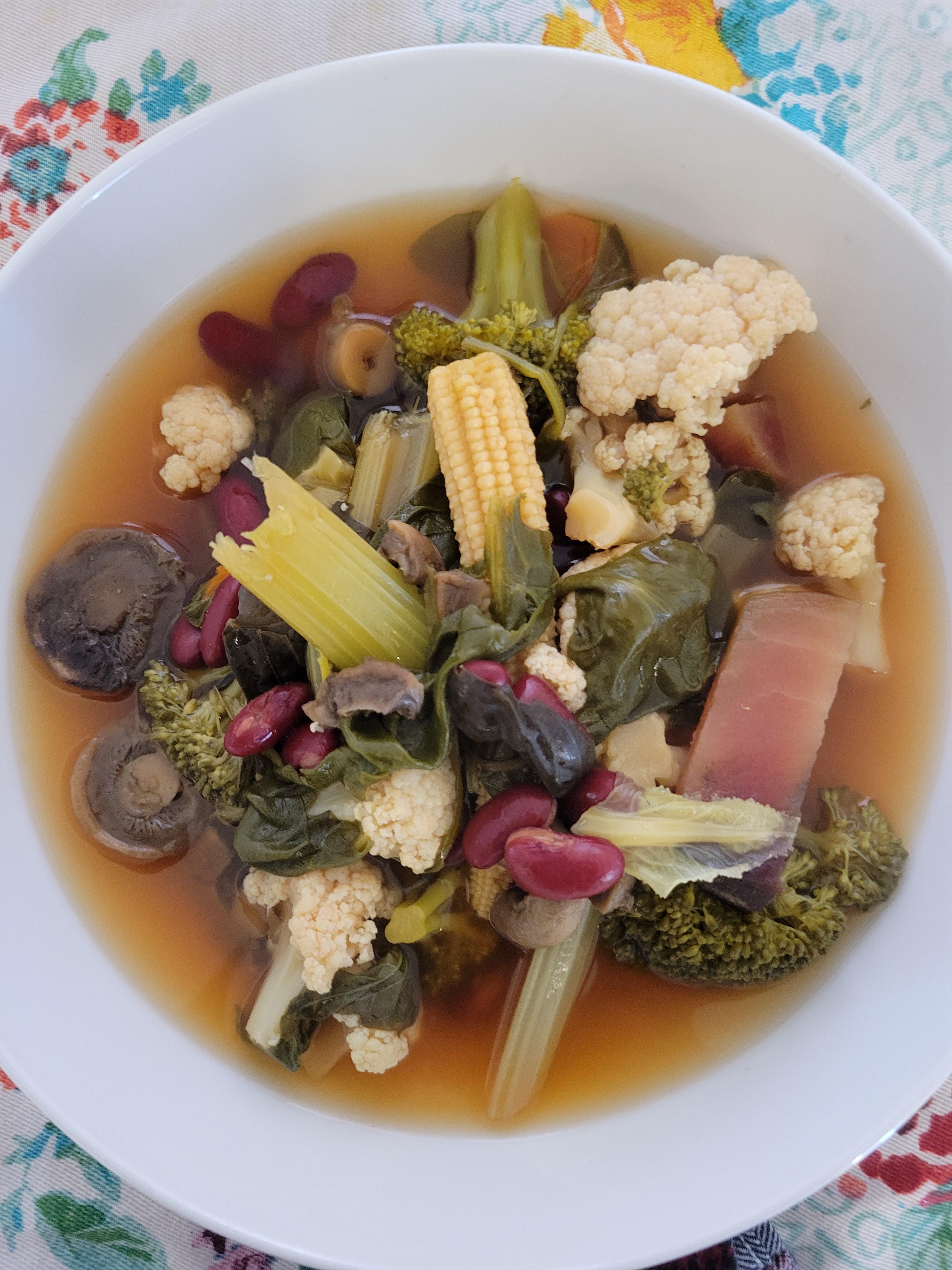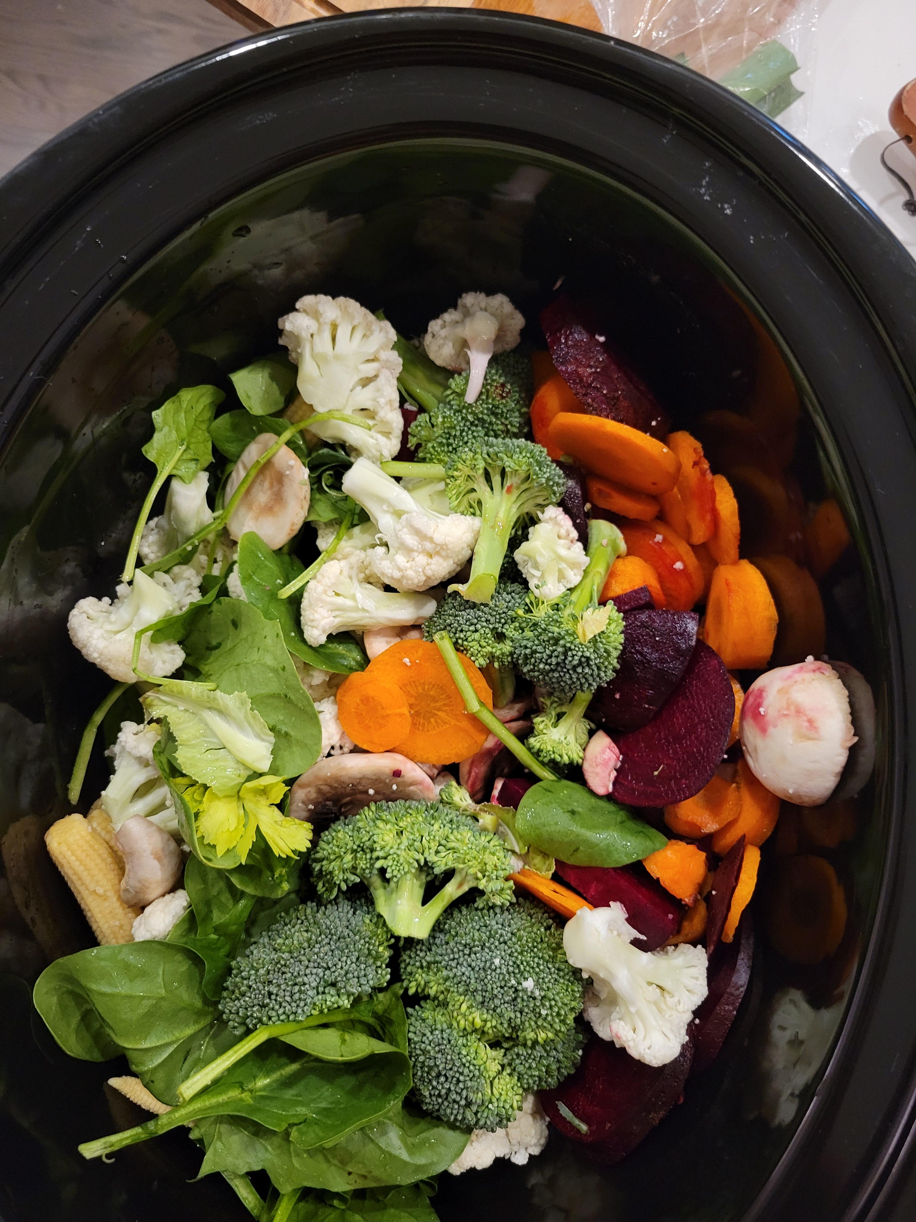 கீரை (Spinach), புரக்கோலி (broccoli), கரட், முட்டைகோவா, பீற்றூட், காளான், Basil இலை,செலரி (celery) ஆகியவற்றை சிறு துண்டுகளாக வெட்டி, பின் அவற்றுடன் சிவத்த கடலை (Red beans), இளம் சோழம் (baby corn) கலந்து crock pot எனப்படும் மெதுவாக சமைக்கும் (slow cooker) இல் போட்ட பின் ஒரு லீட்டர் சோடியம்/ உப்பு கலக்காத மரக்கறி broth இனை விட்டு 8 மணித்தியாலங்கள் வேக வைத்து இந்த கூழை செய்துள்ளேன்.