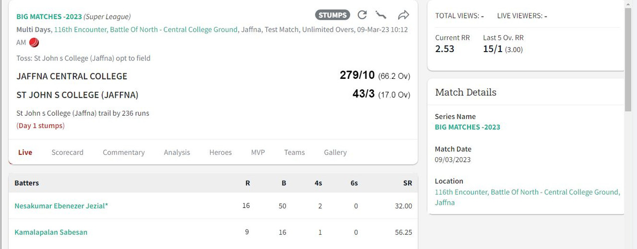 சென் ஜோன்ஸ் 1ஆவது இன்: 127 (நேசகுமார் ஜெஸியல் 43, கமலபாலன் சபேசன் 34, ரஞ்சிதகுமார் நியூட்டன் 27 - 4 விக்., ஆனந்தன் கஜன் 8 - 3 விக்., சுதர்ஷன் அனுஷாந்த் 62 - 2 விக்.)