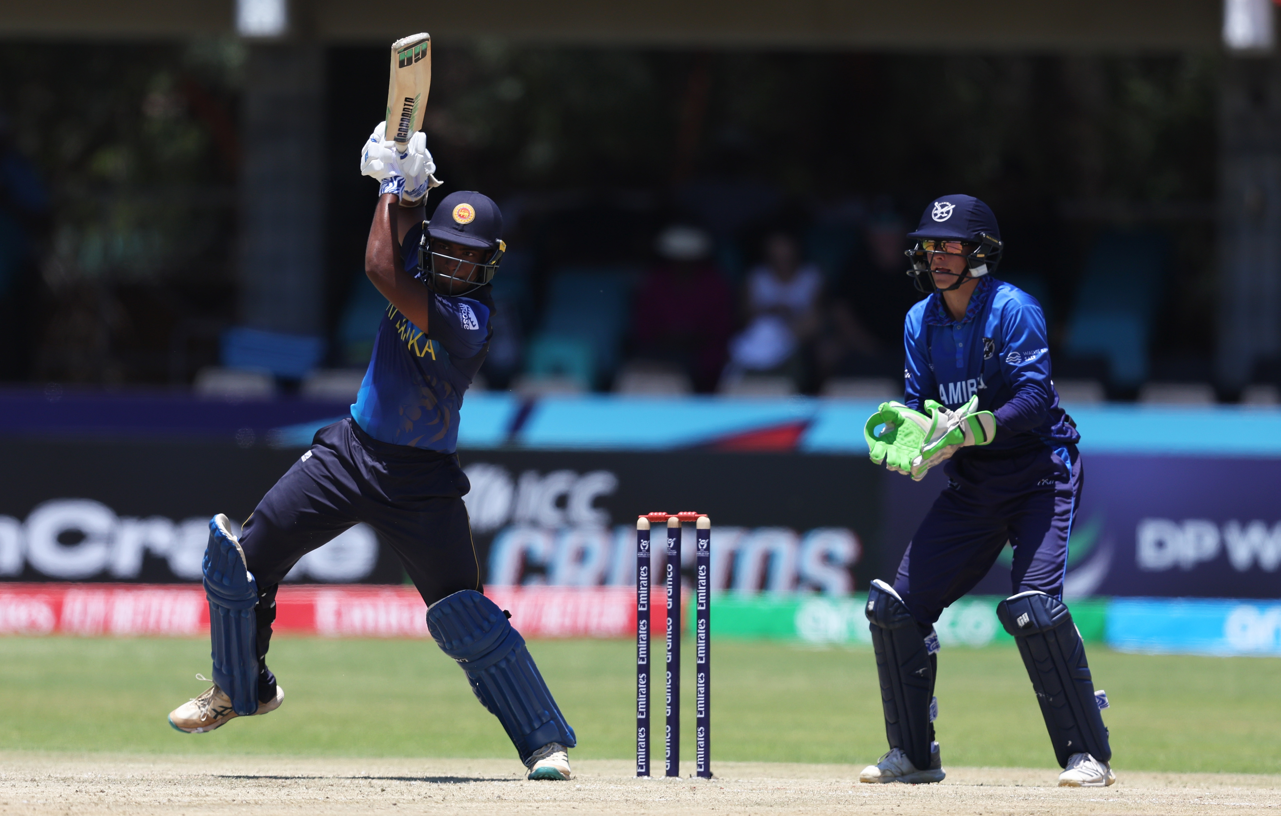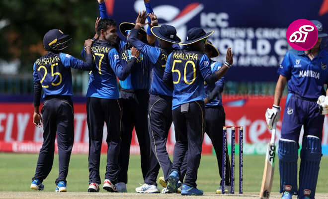 தென் ஆபிரிக்காவின் கிம்பர்லி, டயமண்ட் ஓவல் விளையாட்டரங்கில் புதன்கிழமை (24) நடைபெற்ற சி குழுவுக்கான ஐசிசி 19 வயதுக்குட்பட்ட உலகக் கிண்ண கிரிக்கெட் போட்டியில் துடுப்பாட்டத்தின் போது நமிபியாவிடம் பலத்த சவாலை எதிர்கொண்ட இலங்கை, பந்துவீச்சில் அசத்தி 77 ஓட்டங்களால் வெற்றிபெற்றது.