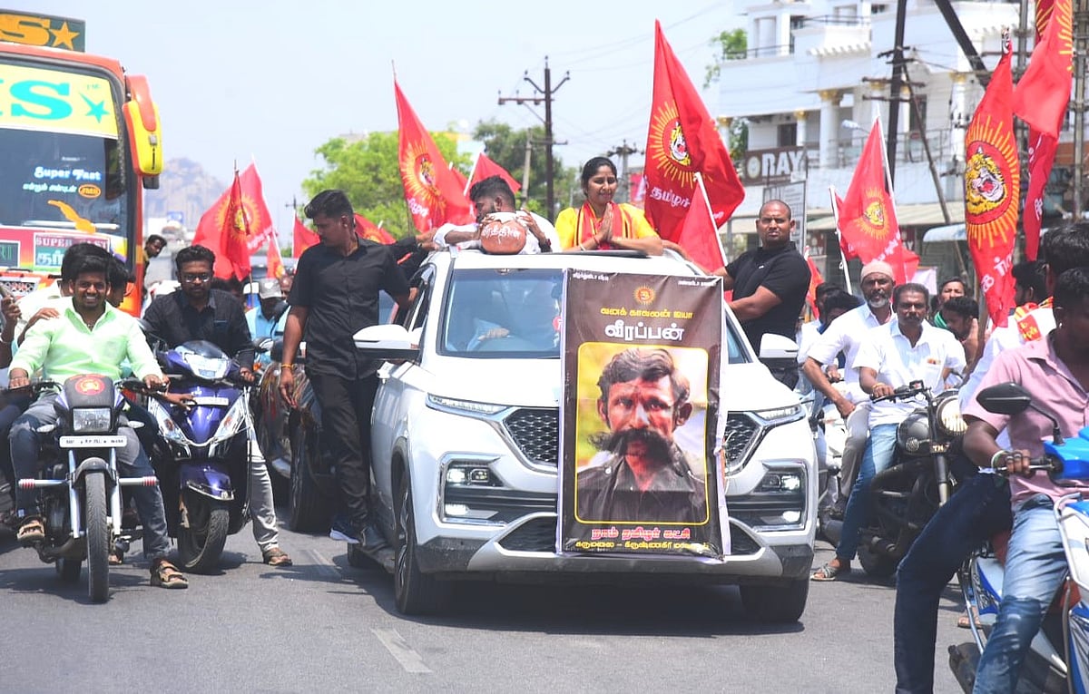 இருசக்கர வாகனங்களில் இளைஞர்கள் அணிவகுத்துச் செல்ல காரின் ‘சன் ரூஃப்’ வழியாக நின்றபடி கையெடுத்து கும்பிட்டபடியே பயணித்தார் வித்யா ராணி. காரின் இருபக்கமும் பௌன்சர்கள் தொங்கிக்கொண்டு வந்தனர். முன்பக்கம் வீரப்பன் பேனர் கட்டப்பட்டிருந்தது. மாமன்னன் அருண்மொழிச் சோழன் வேடம், திருவள்ளுவர் வேடம், அம்பேத்கர் வேடம் அணிந்தபடியும், வழிநெடுக பட்டாசு வெடித்தும், மேளத்தாளம் அடித்தும் நாம் தமிழர் கட்சியினர் அமர்க்களப்படுத்தி வித்யா ராணியை அழைத்து வந்தனர். வேட்பு மனுவை தாக்கல் செய்தபோதும், தனது தந்தை வீரப்பன் மீது சபதம் எடுத்துக்கொண்டார் வித்யா ராணி.