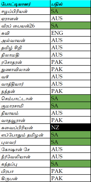 07 பேர் தென்னாபிரிக்கா அணி வெல்லும் எனக் கணித்துள்ளனர். ஒரே ஒருவர் மாத்திரம் நியூஸிலாந்து அணி வெல்லும் எனக்கணித்துள்ளார். போட்டியில் இல்லாத வேறு அணிகளைக் கணித்த 16 பேருக்குப் புள்ளிகள் கிடையாது!