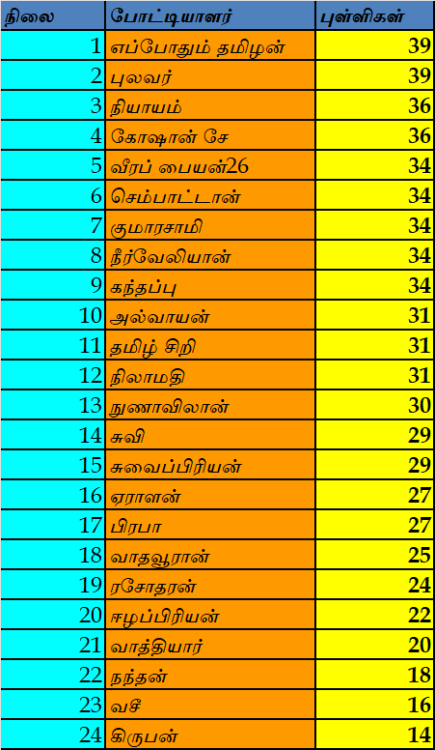 இரண்டாவது அரையிறுதிப் போட்டி முடிவின் பின்னர் யாழ்களப் போட்டியாளர்களின் நிலைகள்: