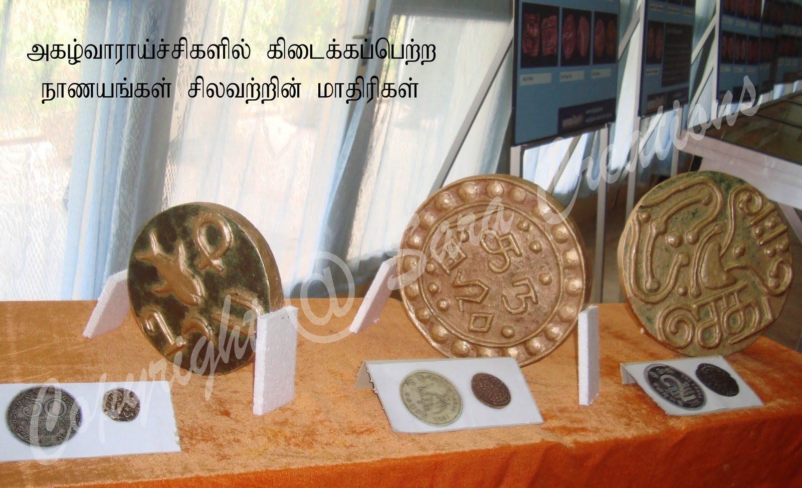 vm-10-02-ma-22+copy.jpg" எம்மவருக்கு பல்லாயிரக்கணக்கான ஆண்டு கால வரலாறு உண்டு. அதைத் தொலைத்து விடாதே " என்று அவை ஒவ்வொன்றும் காதுக்குள் கூறுவது போல் இருந்தது. கி.மு 3 ஆம் நூற்றாண்டு தொட்டு 20 ஆம் நூற்றாண்டுவரை காலத்துக்குக் காலம் பாவனையிலிருந்தநாணயங்கள் , ஓடுகள் , போன்றவை கால அடிப்படையில் காட்சிப் படுத்தப்பட்டிருந்தன. அத்துடன் ஈரெழுத்து பொறிக்கப்பட்ட ஆனைக் கோட்டை சாசன முத்திரை, சுடு மண் கிணறு , பல்வேறு சாசனங்கள் போன்றவை பிரதி பண்ணப்பட்டு வைக்கப்பட்டிருந்தன. அத்துடன் பண்டைத் தமிழர் வாழ்வியலுடன் பிணைந்திருந்த சுடுமண் கிணற்றின் மாதிரி, ஆதிகால நாணயங்களின் மாதிரி ஆகியனவும் கூட பிரதி பண்ணப்பட்டு வைக்கப்பட்டிருந்தன.