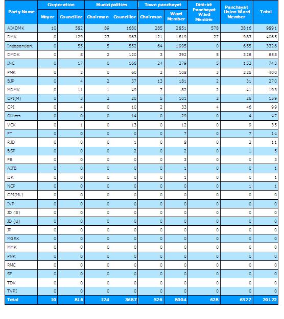 அ.தி.மு.க., 9,864 பதவிகளை கைப்பற்றியுள்ளது. சென்னை, திருச்சி, மதுரை, கோவை, வேலூர், நெல்லை, சேலம், தூத்துக்குடி, திருப்பூர், ஈரோடு ஆகிய 10 மாநகராட்சிகளையும் அ.தி.மு.க.வே கைப்பற்றியுள்ளது.