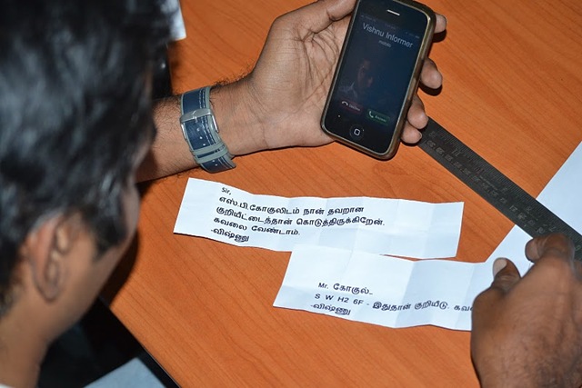 கேஜி குழந்தை மேஜைப் போல பென்சிலும், ஸ்கேலுமாக அலங்கோலமாக இரைந்து கிடந்தது. வாரமலரின் ”குறுக்கெழுத்துப் போட்டி” கண்டுபிடிப்பதைப் போல SWH26Fவை குறுக்காகவும் நெடுக்காகவும் கிறுக்கி முயற்சித்திருந்தார். அப்போதுதான் ”Sir, எஸ்.பி. கோகுலிடம் நான் தவறான..” என்று விஷ்ணு பெயரில் இருந்த அந்தச் சிட்டு அவன் கண்களுக்கு தட்டுப்பட்டது. எட்டு மணிக்கு விஷ்ணுவை சந்திக்கும்போது கேட்க வேண்டும் என்பதற்காக அவன் அனுப்பிய குறியீட்டு மெயிலின் முக்கிய பாகத்தை எடுத்து மேஜையில் இருந்த சீட்டுடன் பொருத்திப் பார்த்துச் சிரித்தான். விஸ்வநாதனின் மொபைல் வைப்ரேஷன் மோடில் தையதக்காவென்று குதித்தது. கையிலெடுத்துப் பார்த்த கோகுலுக்கு வியப்பு. அதில் Vishnu Informer என்று ஒளிர்ந்தது. இந்த நேரத்தில் இவனெதற்கு இவரைக் கூப்பிடுகிறான் என்று யோசித்தவாறே மீண்டும் மேஜையில் மொபைலைக் கிடத்தினார் கோகுல்.