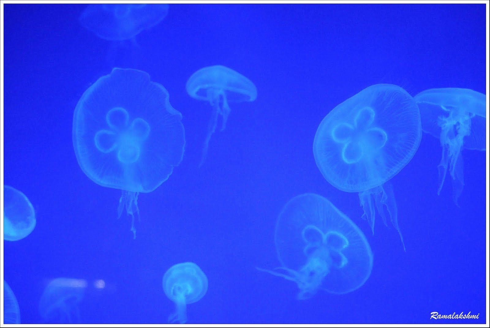 ஆரஞ்சு பிங்க் என விளக்கொளியில் வண்ணம் மாறி மாறி ஜொலிக்கின்றன நிறமற்ற ஜெல்லி மீன்கள்.