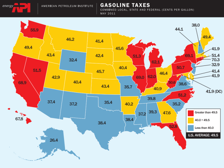 அமெரிக்காவில் ஒரு கேலன் ,3.7 லிட்டர் விலை 3.2 அமெரிக்க டாலர், அங்கு பெட்ரோல் மீது விதிக்கப்படும் வரி தேசிய சராசரி 16% , அங்கே அலாஸ்காவில் மிக குறைவாகவும் மற்ற மாகாணங்களில் வேறு வேறு விகித வரி உள்ளது.
