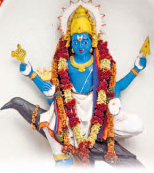 இவன் ஏறிவரும் தேர் இரும்புத் தேர்! கருநீல நிற ஆடை புனைந்த 8 குதிரைகள் இவனது தேரை இழுத்து வரும்! (8 கருங்கழுகுகள் இழுக்கின் றன என்று சில நூல்கள் கூறும்)