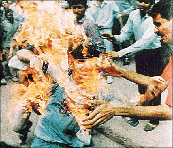 1990-இல் வி.பி.சிங் காலத்தில் மண்டல் ஆணையத்தின் பரிந்துரைகளை நடைமுறைக்கு கொண்டுவர முயன்ற போது, அதை எதிர்த்து ‘ராஜிவ் கோஸ்வாமி’ என்ற கல்லூரி மாணவன் டெல்லியில் தன்னை எரித்துக் கொள்ள முயன்றான். அப்போது காப்பாற்றப்பட்ட அவன் 2004-ஆம் ஆண்டு தன் முப்பத்தி மூணாவது வயதில் அதன் பாதிப்பில் இறந்து போனான்.